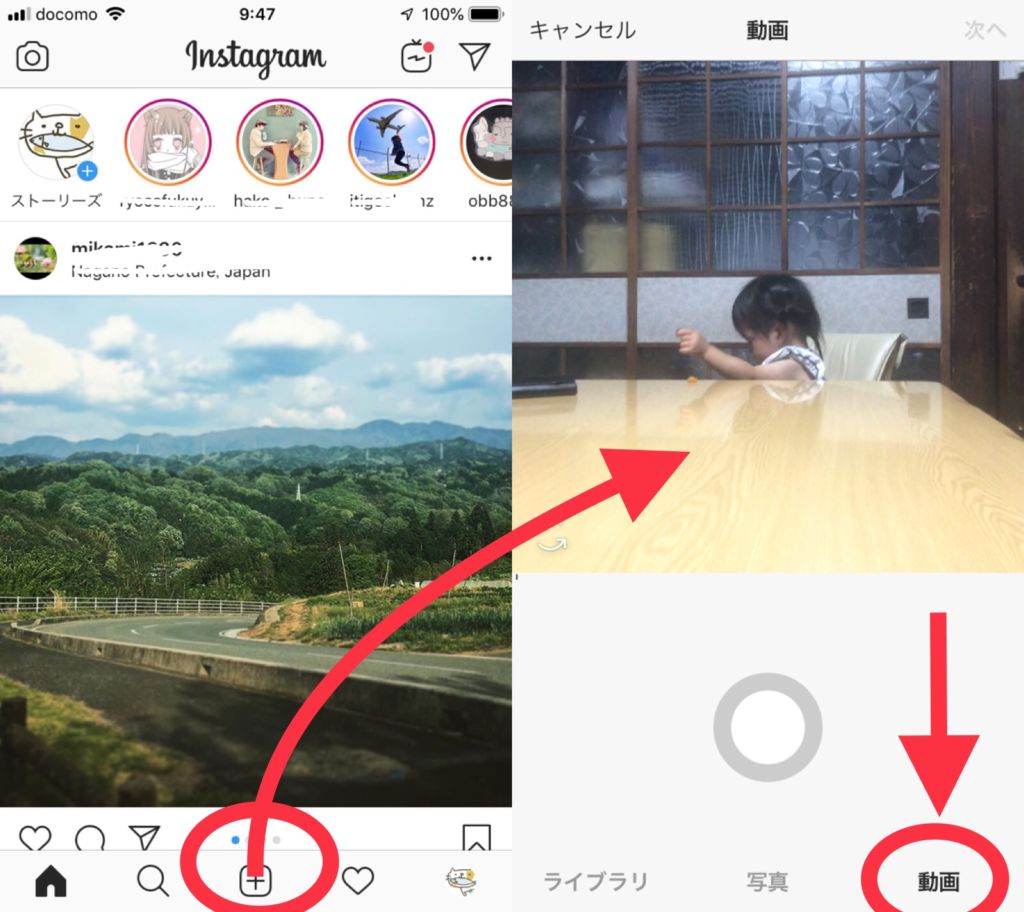 Instagramで動画を撮影して投稿する方法 iPhoneアプリPLUS1WORLD。