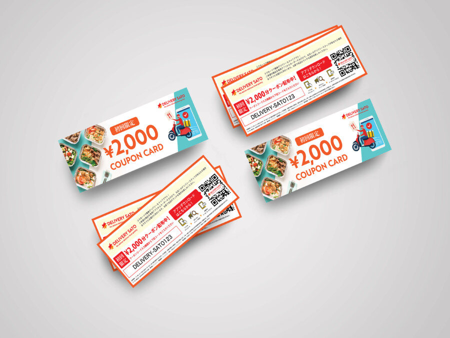 チラシ制作事例 – フードデリバリーの取っておきたくなる長方形クーポンチラシデザインASOBOAD。