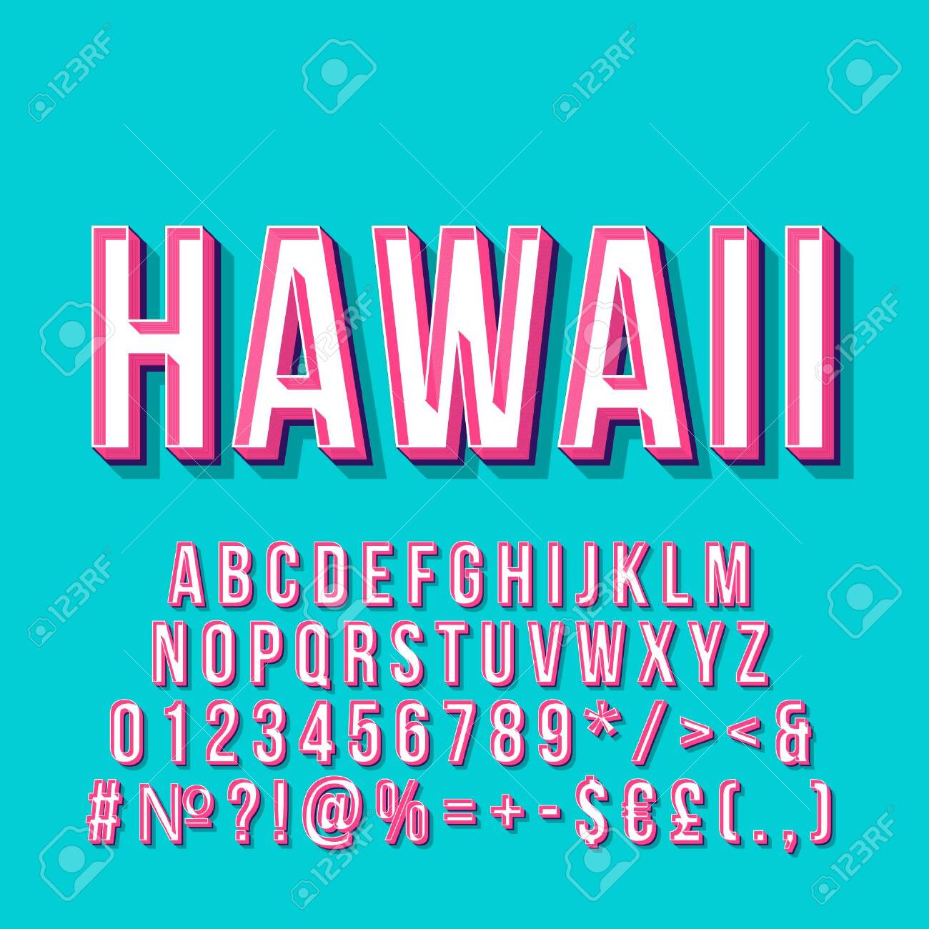 ハワイヴィンテージ3Dベクトルレタリング。レトロな太字フォント、書体。ポップアートのスタイル化されたテキスト。古い学校スタイルの文字、数字、記号、要素パック。90年代、80年代のポスター、バナー。ベビーブルーの色の背景のイラスト素材・ベクターImage 129559065。