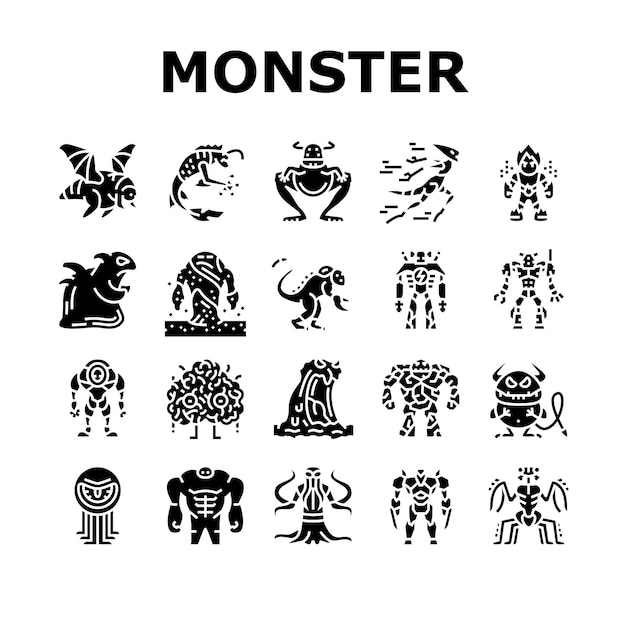 モンスターの怖いファンタジーキャラクターのアイコンセットベクター画像。飛んでジャンプするモンスター、速く走って浮かぶ、昆虫とロボット、エイリアンと有毒。火と砂の謎のミュータントカラーイラストのイラスト素材・ベクターImage 190339857。