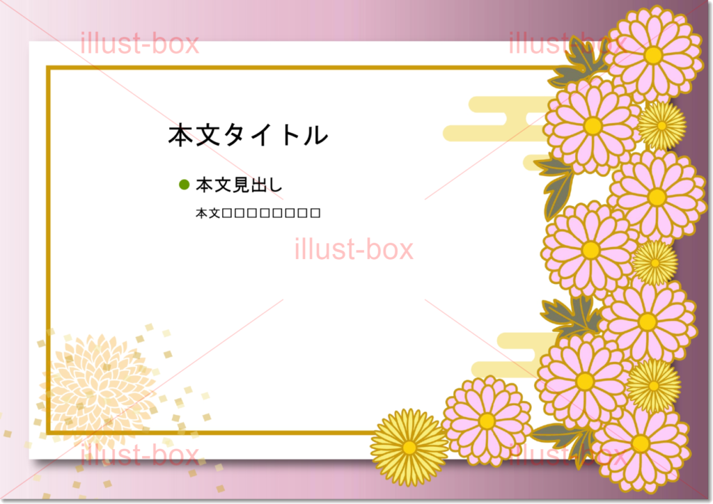 和風デザインのパワポテンプレート・菊の花のイラスト、フレーム付・表紙を合わせた3枚のスラ イラストボックス「プレミアム」テンプレート。