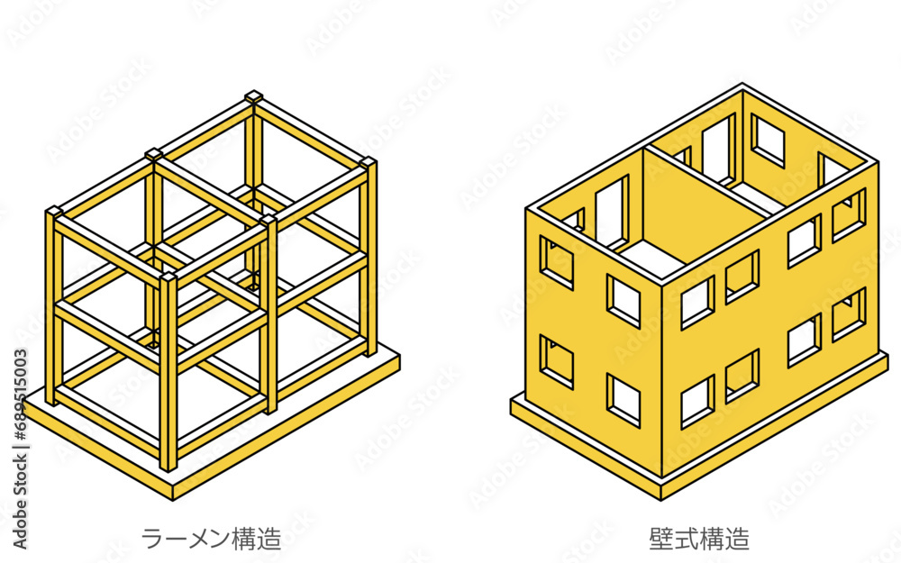 建築構造の図解イラスト、鉄筋コンクリート RC のラーメン構造と壁式構造、アイソメトリック Stock VectorAdobe Stock。
