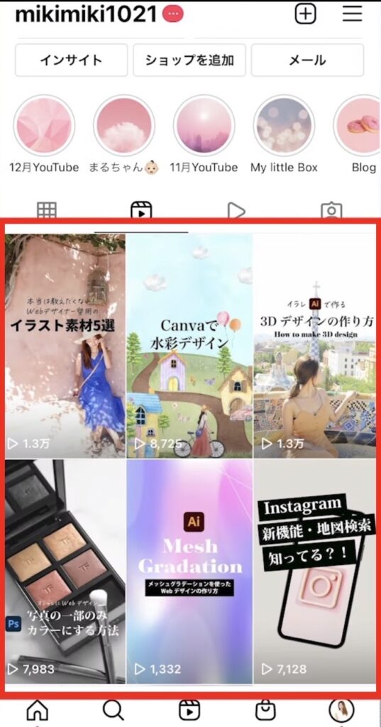 前々回でお伝えした リールカバーの作り方を読んで 作ったけど、今までにアップしたリールにも表紙つけたいけどできる? とご質問いただきました。 もちろん! 今までのリール投稿全部に表紙を付けるのは簡単! ということで、 インスタリール表紙の後付け。