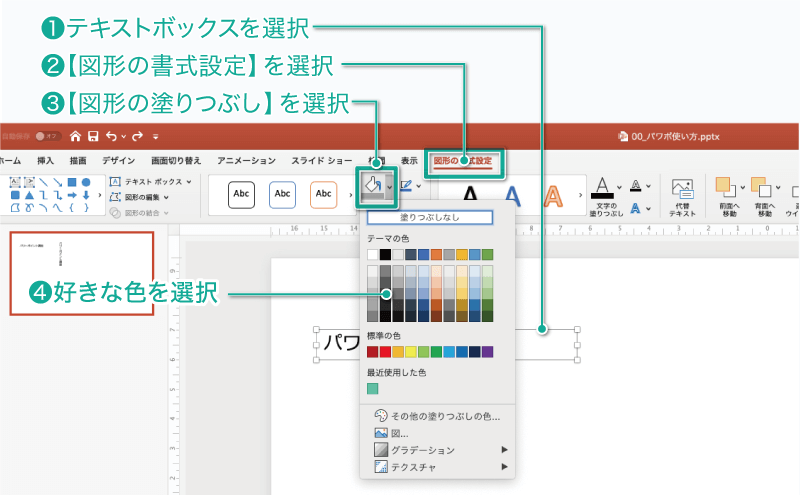 パワーポイントでテキストボックスの背景色を変える方法と活用法。
