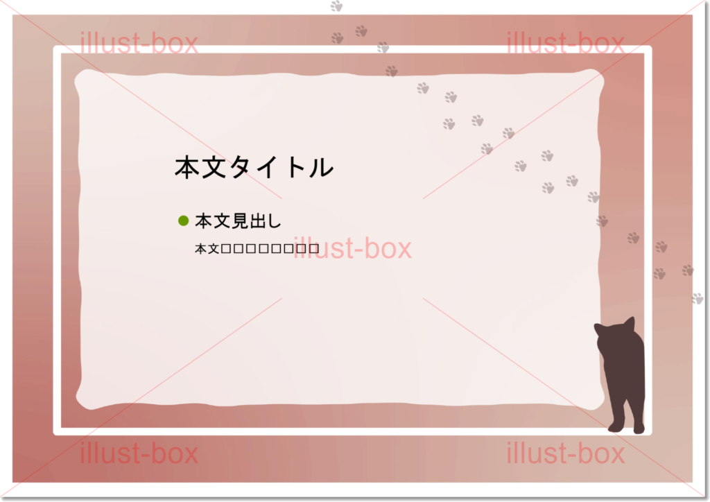 落ち着いたカラー背景、見やすいパワポのテンプレート・ねこと足あとのかわいいデザイン付き・ イラストボックス「プレミアム」テンプレート。