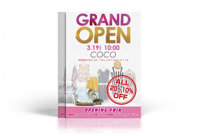 チラシ制作事例 – アパレルショップのグランドオープンを告知するチラシデザインASOBOAD。