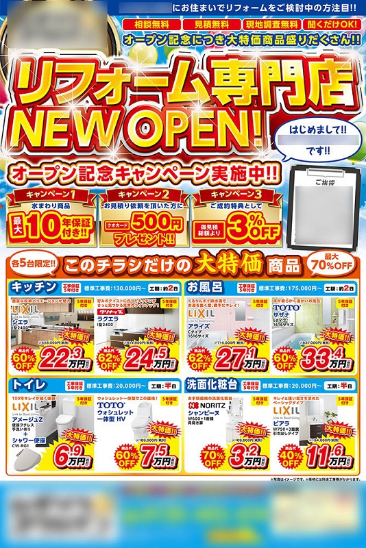 オープンチラシリフォーム・外壁塗装のチラシデザイン、ホームページ制作はチームカスガイ。