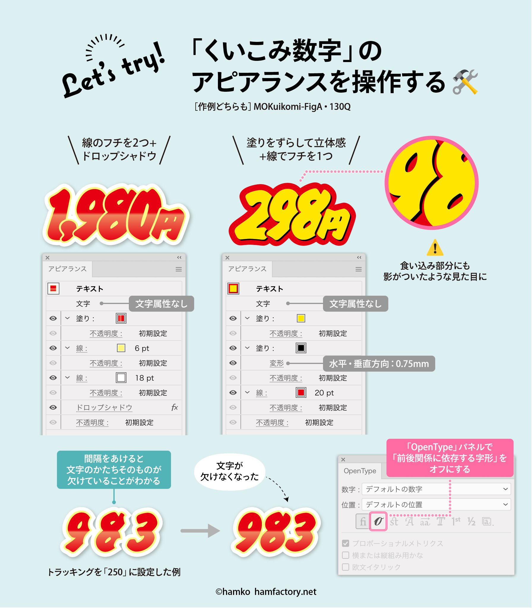 hamko on X: "スーパーのチラシの価格表記などで見かける「くいこみ数字」フォントをインストールしたのでさっそく勉強がてら遊んでみました。目的に特化してるフォントなだけあって、調整なしでもそれっぽくなるので驚き。アピアランス機能をつかった装飾もふつうに。