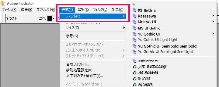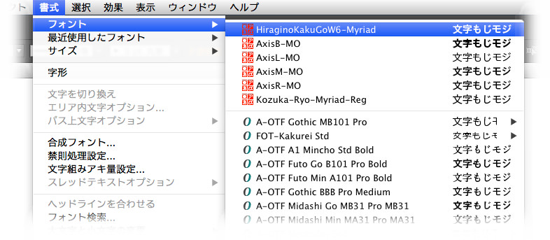 Illustrator CS3~CS5のフォントメニューにフォント名が表示されない。