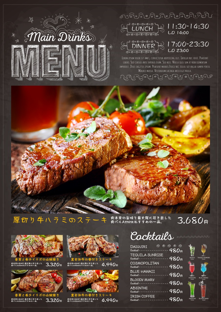 エーシンク株式会社 - Design store飲食店 肉バルメニューポスターデータ A3サイズ。