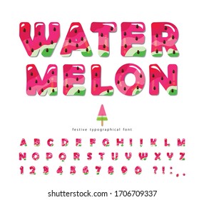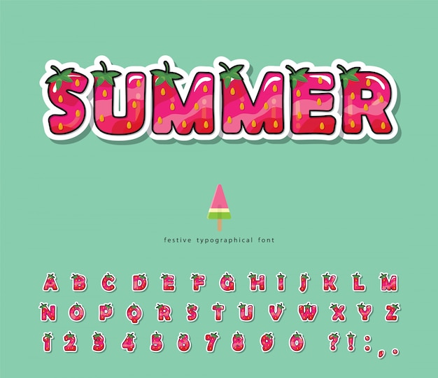 スイカ夏のトレンディなフォント。漫画の装飾紙はアルファベットを切り取った。かわいい面白い文字と数字。ポスター、バナー、Tシャツ、パンフレットデザイン用。ベクトルのイラスト素材・ベクターImage 142459260。
