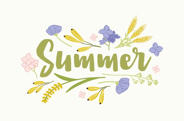 エレガントな筆記体フォントで書かれ、美しい花が咲く花、耳、穀物の穂に囲まれた夏の言葉。分離された季節の碑文。図Premiumベクトル素材。
