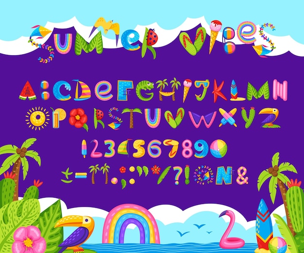 漫画夏フォント ビーチ パーティー タイプ熱帯休暇と休日書体ベクトル アルファベット夏フォントタイポグラフィ文字海とジャングルのテキストのカラフルな虹ビーチとヤシの木の ABC タイプPremiumベクトル素材。