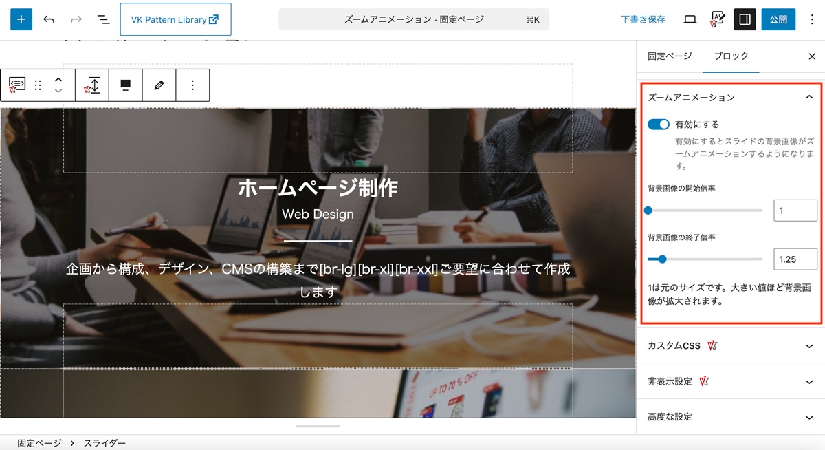 VK Blocks 1.105.0 のスライダーブロックにズームアニメーション機能を追加しました株式会社ベクトル。