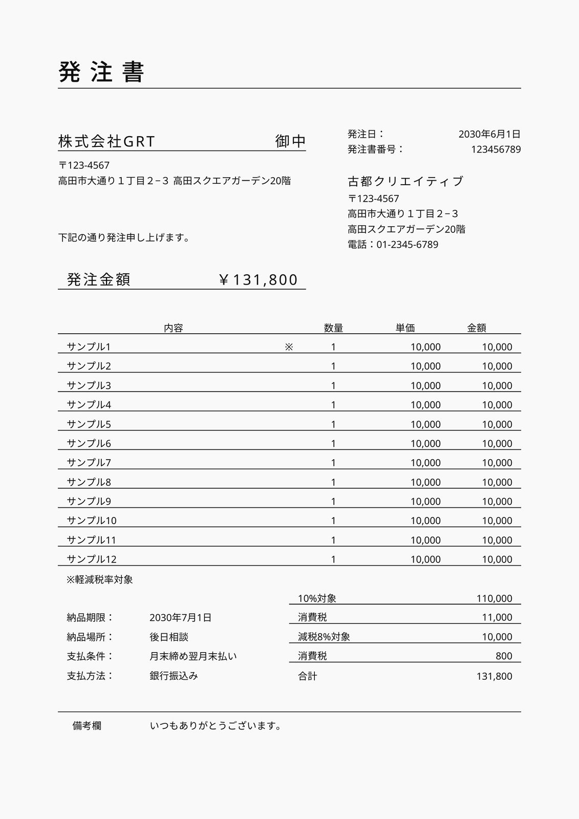 注文書の書式・文例テンプレート Excel・エクセルテンプレート・フリーBiz。