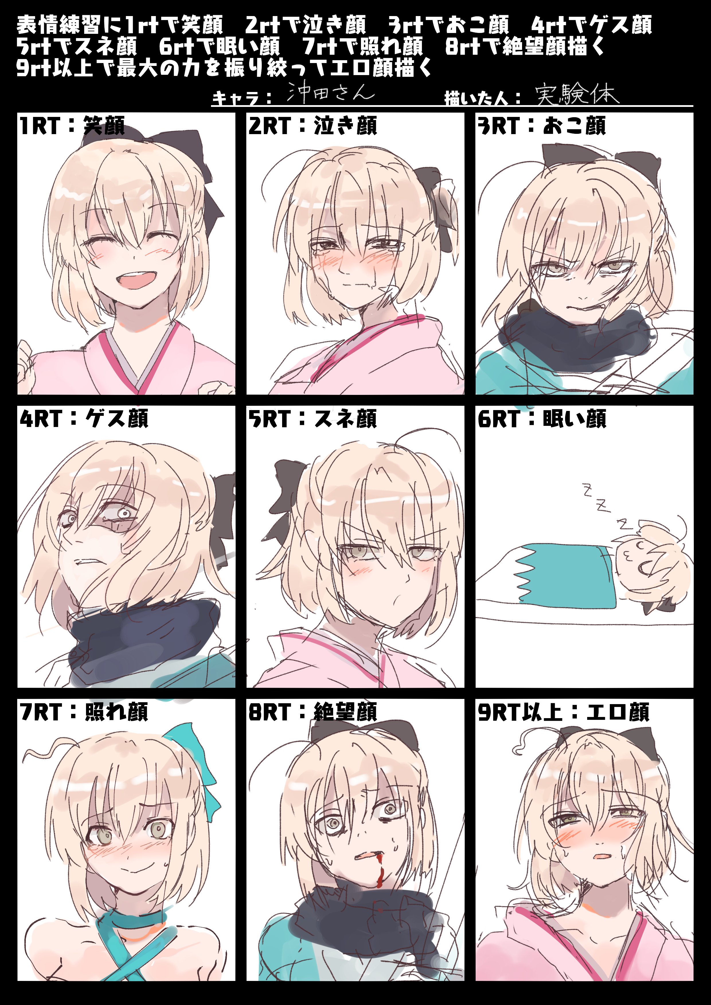 実験体 on X: "表情練習に1rtで笑顔2rtで泣き顔3rtでおこ顔4rtでゲス顔5rtでスネ顔6rtで眠い顔7rtで照れ顔8rtで絶望顔 描く9rt以上で最大の力を振り絞ってエロ顔描く クオリティの差はゆるして https:t.co lq0hEEBQfM"X。