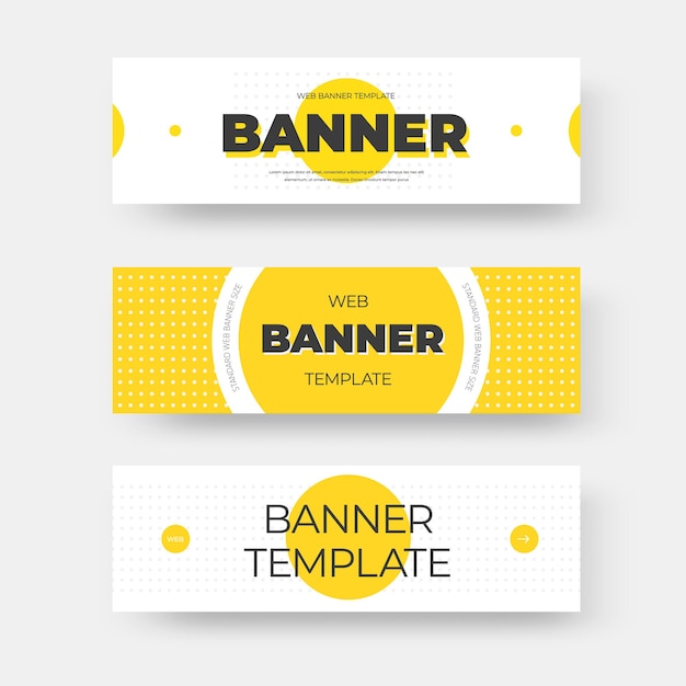 円の矢印ボタンが付いた長方形の水平ウェブバナーテンプレート。広告用の黄色、白、黒の色のレイアウトデザイン。Premiumベクトル素材。