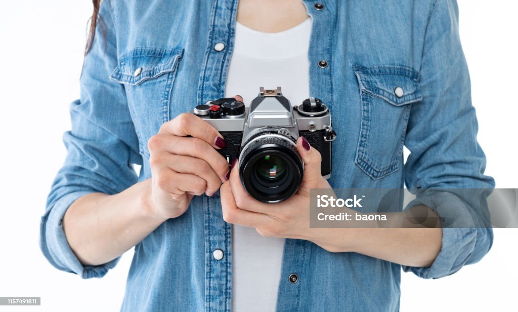 白い背景に一眼レフカメラを持つ女性の手 - カメラのストックフォトや画像を多数ご用意 - カメラ, クローズアップ, 手に持つ - iStock。