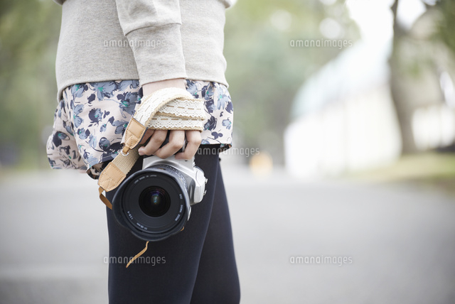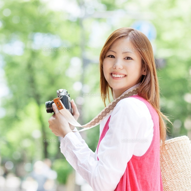 カメラを手に持って微笑む女性 33000004608 の写真・イラスト素材アマナイメージズ。