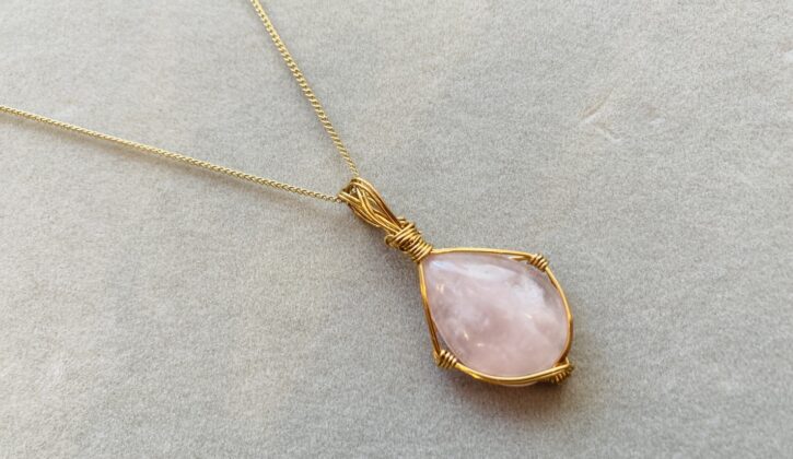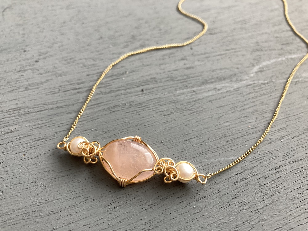 ワイヤーアクセサリー ワイヤーラッピング、ピンクカルセドニーペンダント、天然石ビーズ、作り方、wire jewelryTutorial、beaded jewelry 、wire wrapping。