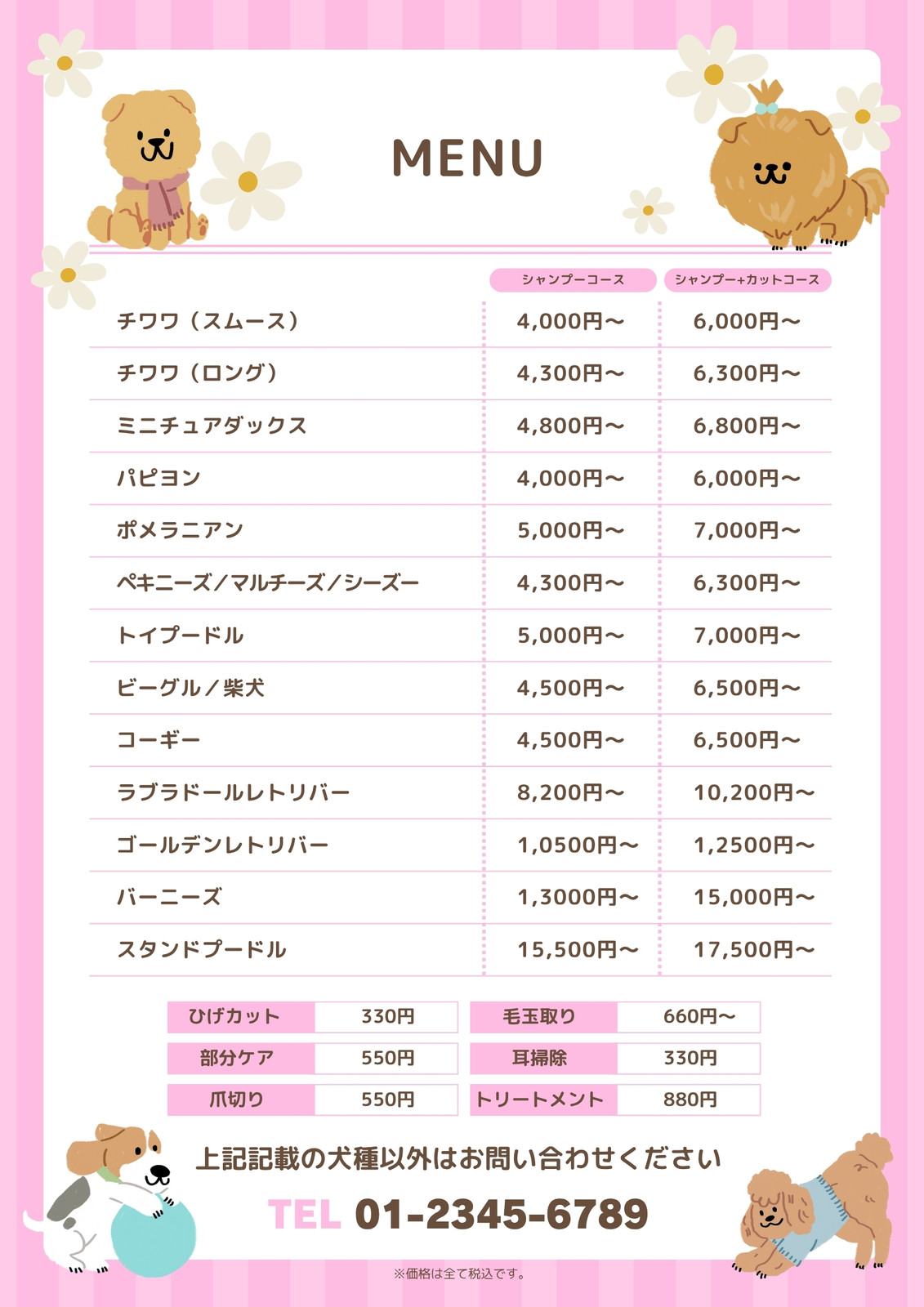 トリミングチラシ 可愛いわんちゃんのチラシ・フライヤーデザインテンプレートがおすすめ。美容チラシ リーフレット・パンフレット作成-エステ・ネイル・クリニック・ヘアサロン。