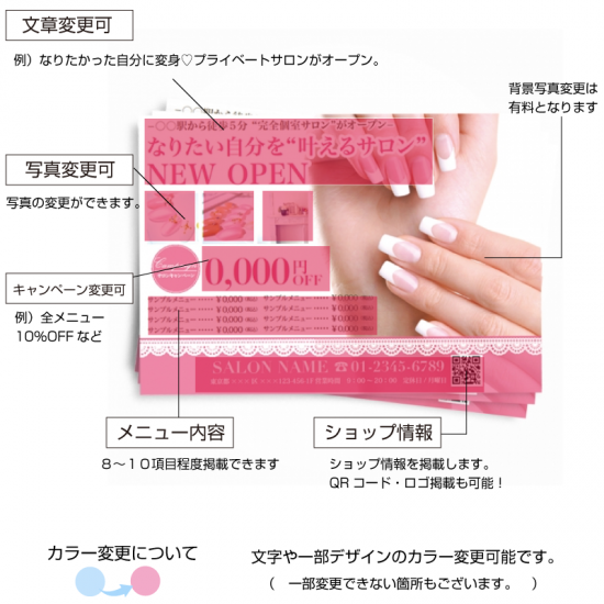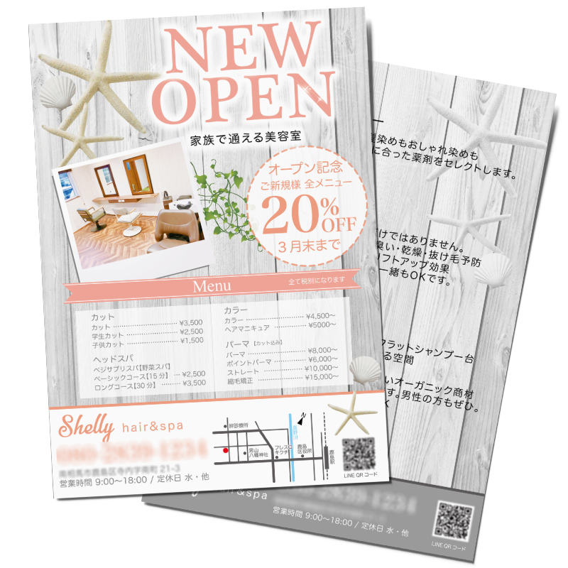 サロン料金表 チラシ・フライヤーサロン開業時の印刷テンプレート・送料無料美容チラシ リーフレット・パンフレット作成-エステ・ネイル・クリニック・ヘアサロン。