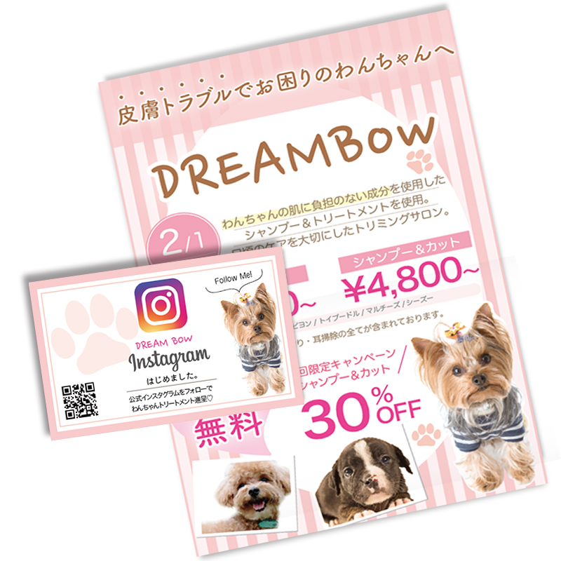 トリミングサロンチラシ サロンパンフレットやサロンチラシが可愛い!エステやネイルサロン様に人気美容チラシ リーフレット・パンフレット作成-エステ・ネイル・クリニック・ヘアサロン。