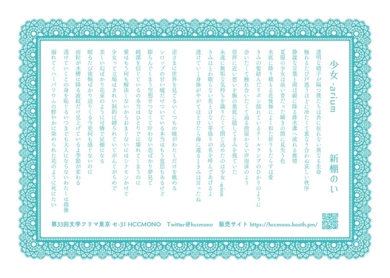 新棚のい あらたなのい 9 14文学フリマ大阪さ-72 9 23そうさくマーケットつ04b on X: "文フリの無配ペーパーだった連作「少女-arium」ネットプリントネプリ短歌tanka セブンイレブン 49652088 それ以外 ZY84P9DZFR A4カラー:60円、2021 12 05迄 よろしくおねがい。