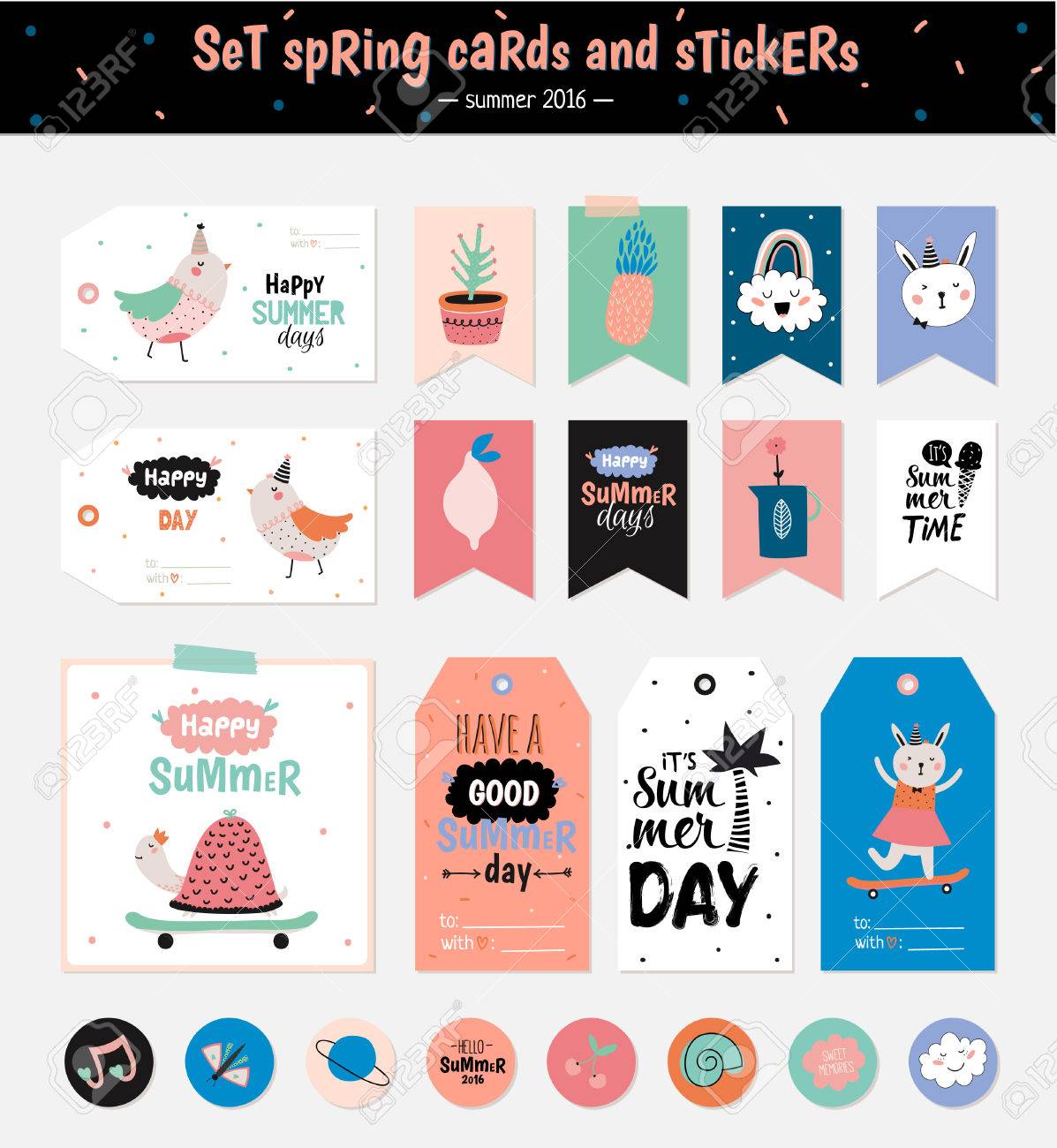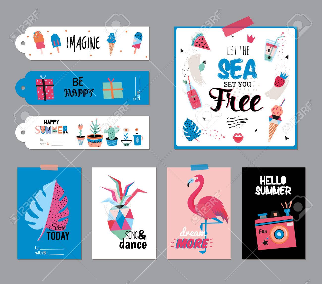 かわいい夏の北欧は、グリーティング カード、ギフトタグ、ステッカーとトレンディな夏の要素とラベル テンプレートのセット。ベクトル。夏の現代概念グラフィックデザインの要素を持つ。フルーツ アイス クリームのイラスト素材・ベクター Image 62145022。