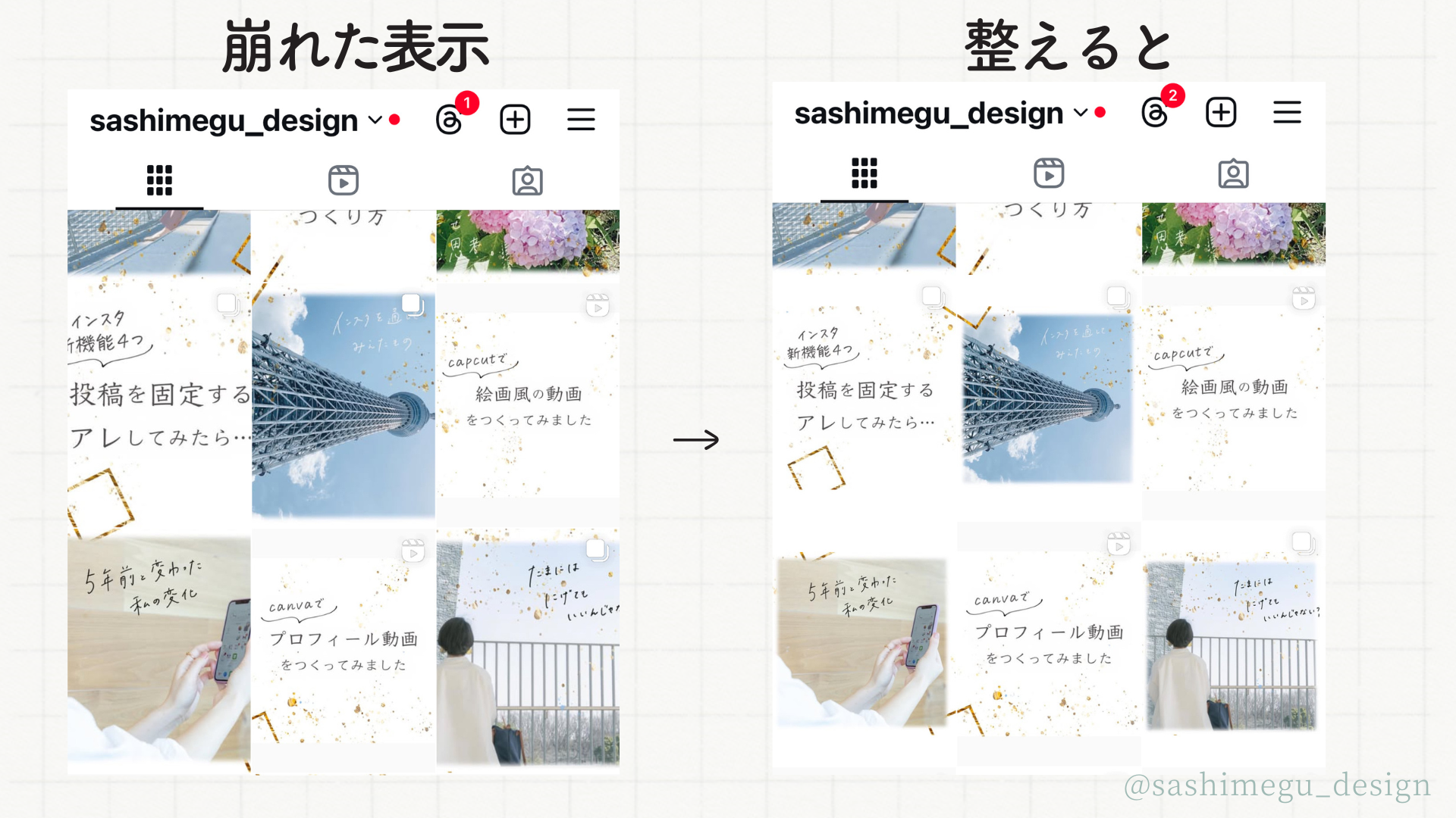 2025年の1月から Instagramの通常投稿の写真の サイズが変わりました。 それまでの正方形から 4対5の縦長のサイズに 変更されたので、今まで正方形で作成していた方は 一覧で見た時の表示が崩れちゃった という方も多いと思います。 写真を作り直すことなく、 一覧表示。