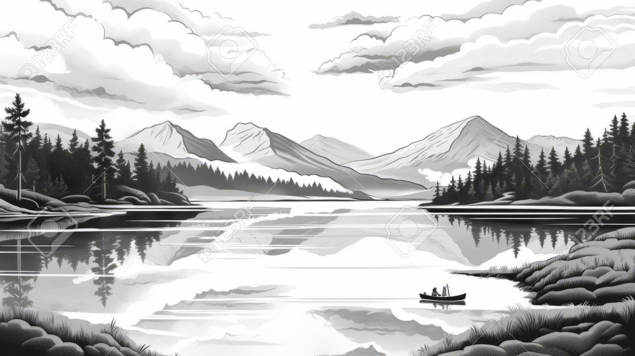 この白黒の絵は、ボートが水面に反射する穏やかな風景を描いています。緻密なキャラクターイラストや山岳風景はエディトリアルイラストを彷彿とさせ、淡い栗色とグレーは口笛を感じさせます。スモーキーな背景は、 心理的現象のイラストに追加されます。AI 生成の写真素材。