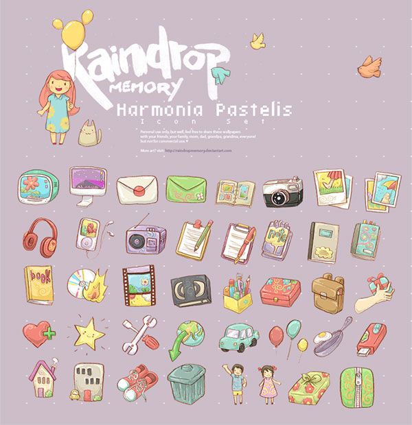 フリー素材かわいい手描き風イラストを使ったデスクトップアイコンセット115種類。