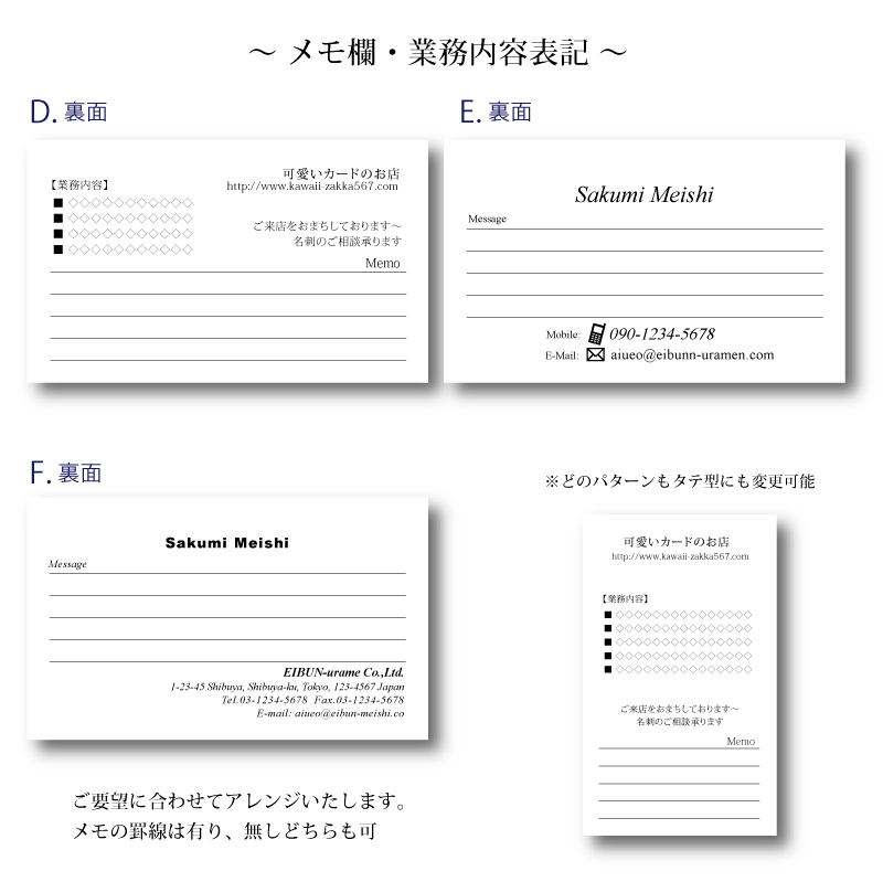 楽天市場 名刺裏面印刷 メモ memo。レイアウト、内容は自由です。表記の価格はモノクロ100枚の場合の価格です。色、枚数によって価格が変わります。正確な価格はお申込み確認後、改めてお知らせします。: アウェイクスタイル。