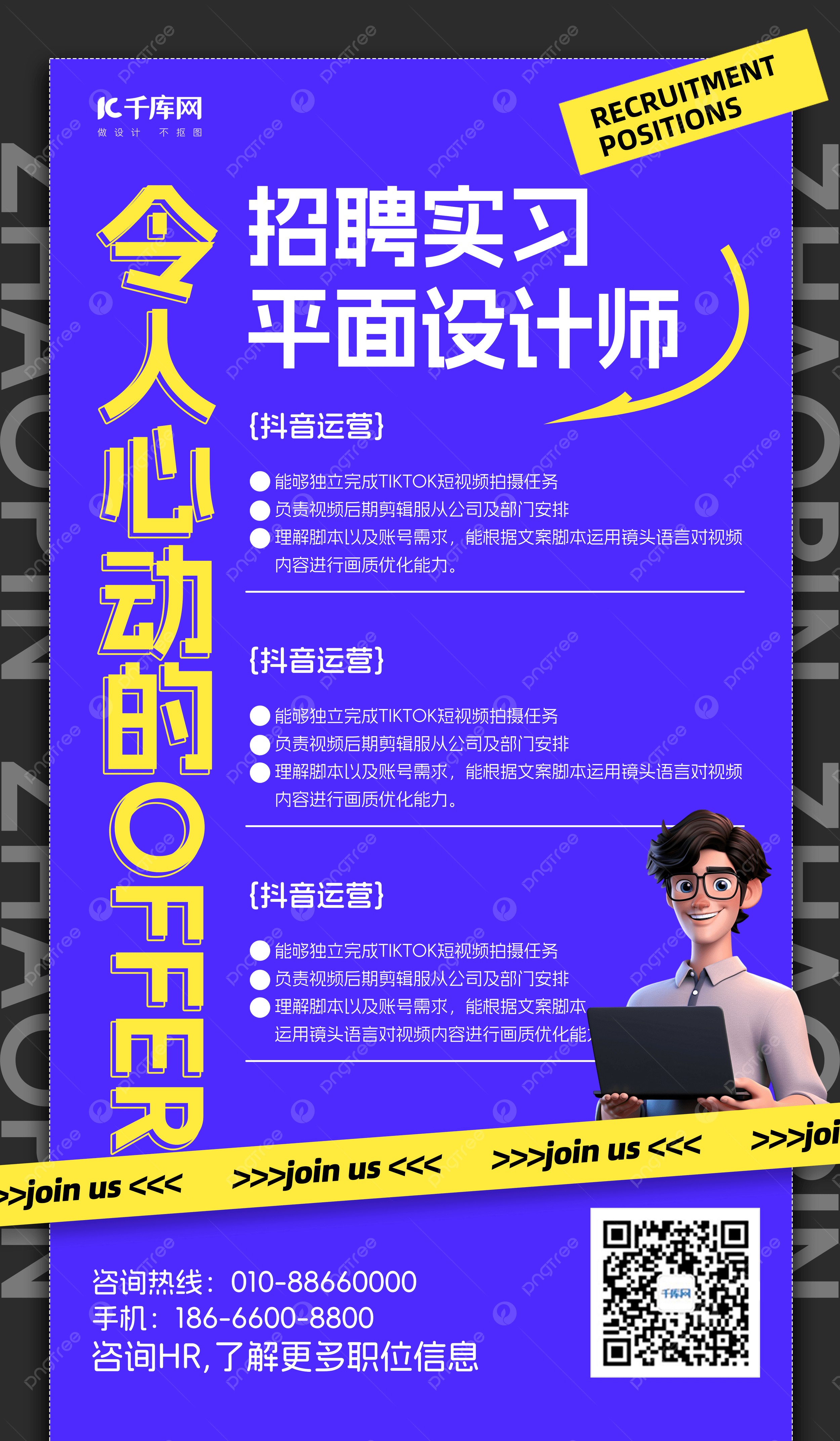 募集インターンシップ3dキャラクターブルーのシンプルな広告ポスターイラストテンプレート素材PSDダウンロード。