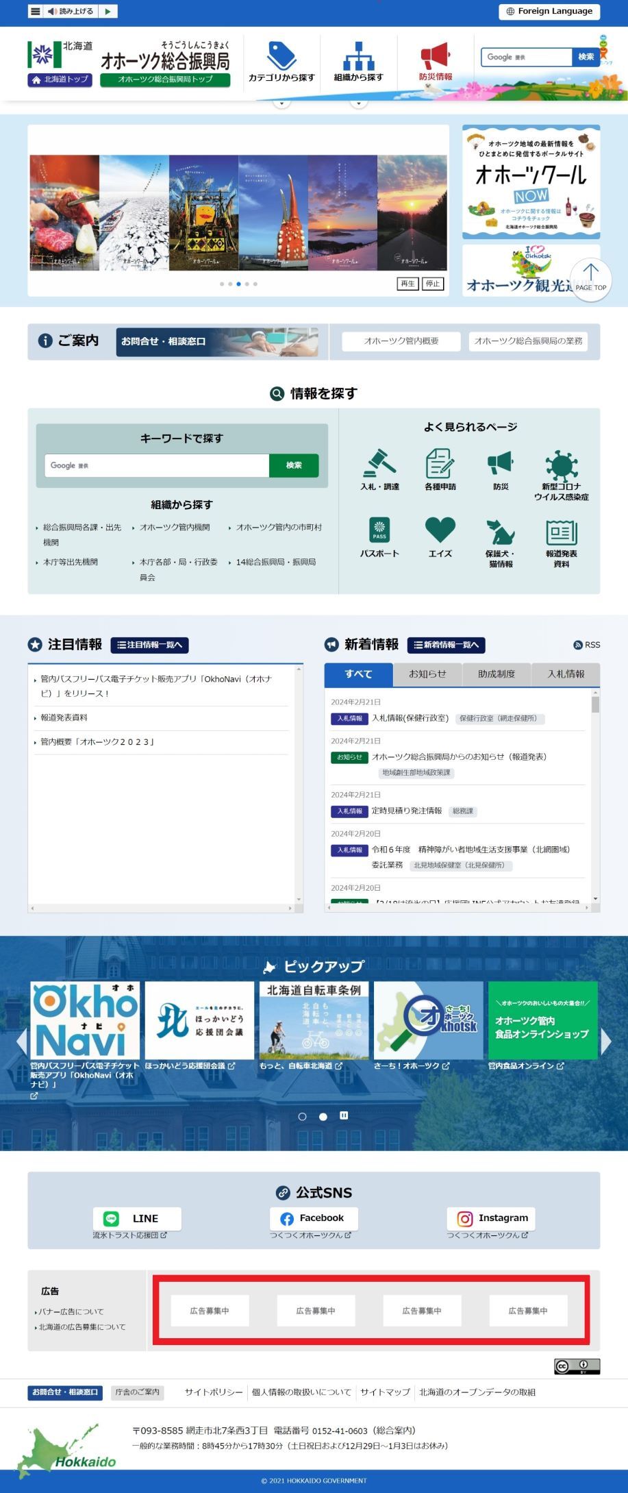 トップページのバナー広告を募集します - オホーツク総合振興局地域創生部地域政策課。