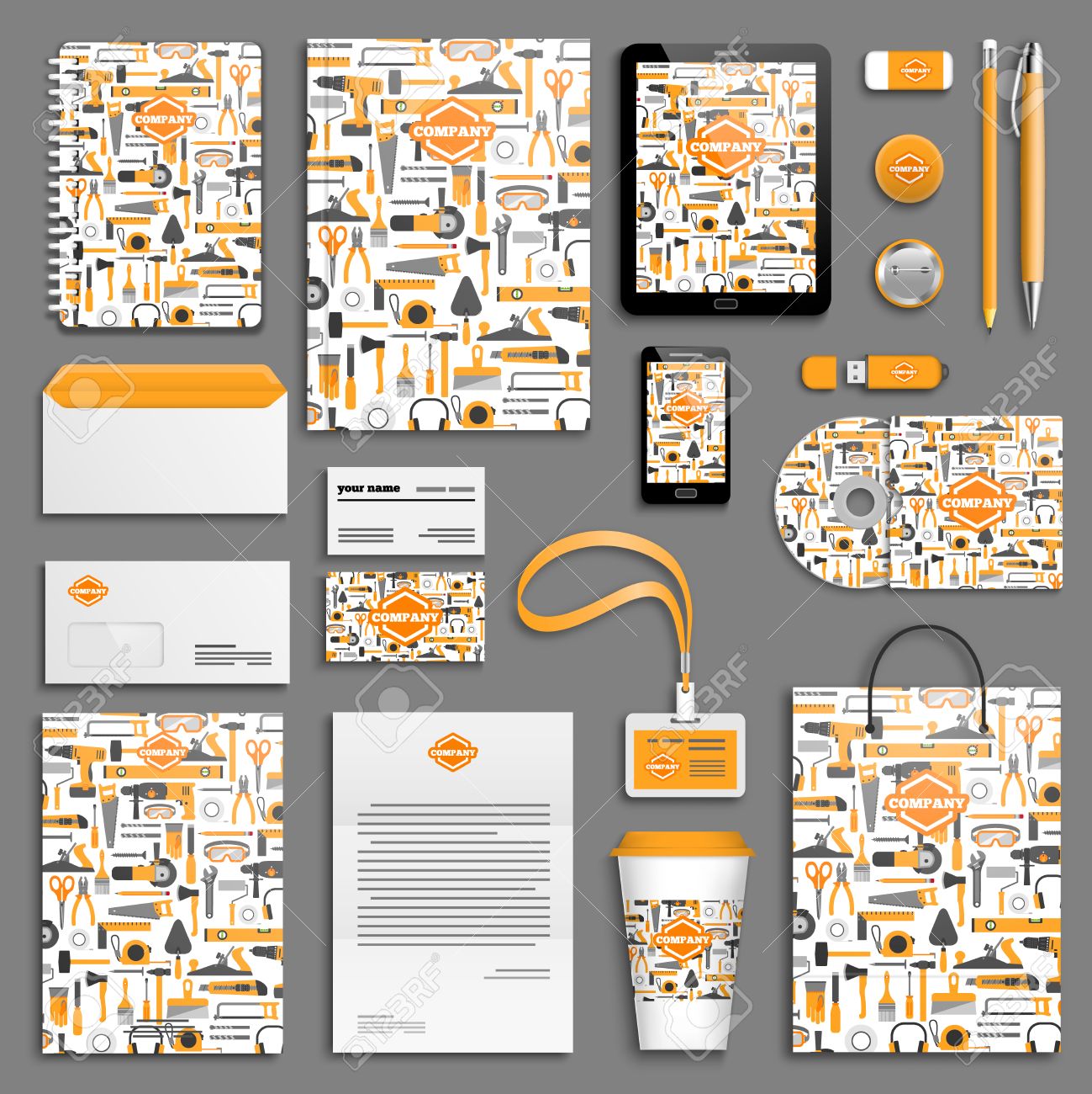 作業ツール企業の Id テンプレートを設定します。ロゴ入りビジネス文房具モックアップ。ブランディング デザイン。のイラスト素材・ベクター Image46485368。