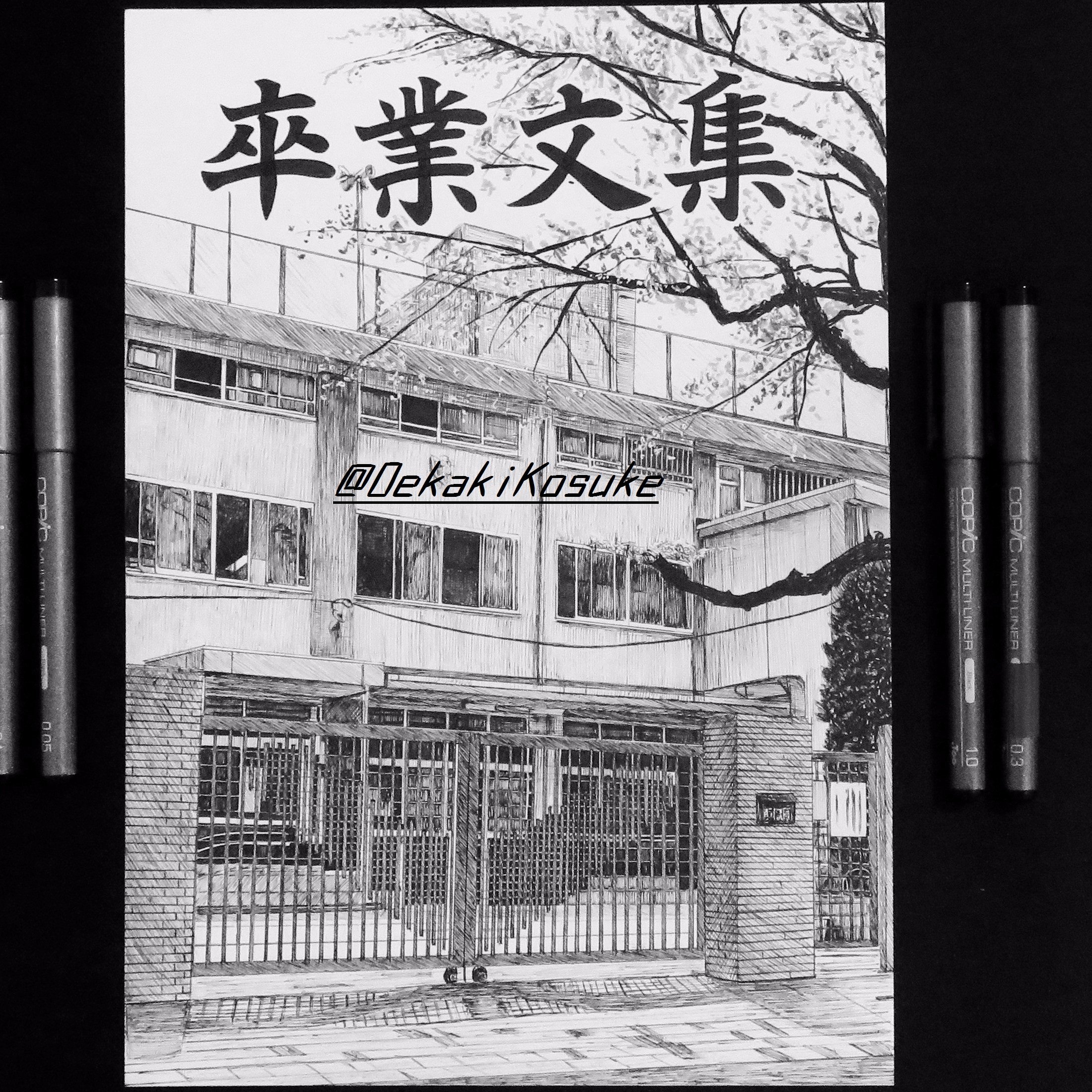 お絵描き練習中こーすけ on X: "『卒業文集 表紙』模写 今日は一日かけて学年主任の先生から依頼された卒業文集の表紙 絵を描き上げました。小学校の時は校舎全景でしたが、今回は卒業生が必ず毎日目にする三年昇降口をピックアップして細部まで描き込みました。この絵で。