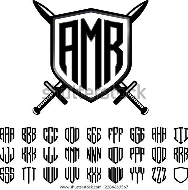 ロゴタイプ、ロゴ、刺繍、ネックレス用の3文字のアルファベットフォントと剣のシールド」のベクター画像素材 ロイヤリティフリー2284669567Shutterstock。