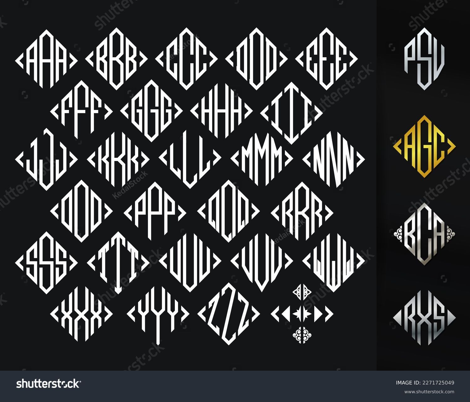 スクエアダイヤモンドモノグラム3文字のアルファベットロゴタイプ、ロゴ、刺繍、ネックレス、ジュエリー、または名前の略称のためのフォント」のベクター画像素材 ロイヤリティフリー2271725049Shutterstock。