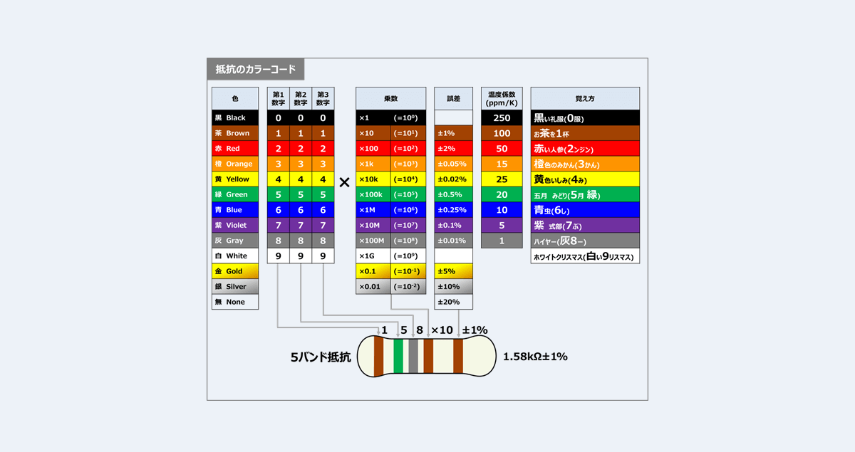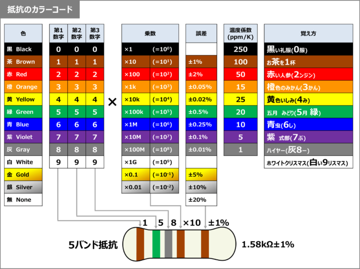 抵抗の『カラーコード』について!一覧表・読み方・覚え方など。
