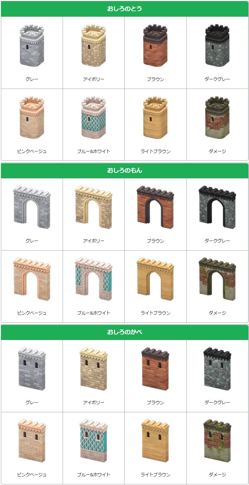 あつ森 攻略 あつまれどうぶつの森ネタまとめ on X: " あつ森お城シリーズ🏰お城シリーズは全部で3種類。 カラバリはそれぞれ8種類で、『 おしろのとう』『おしろのかべ』はリメイクで紋章をつけることができます。 ・おしろのとうのカラバリ、入手方法 https:t.co。