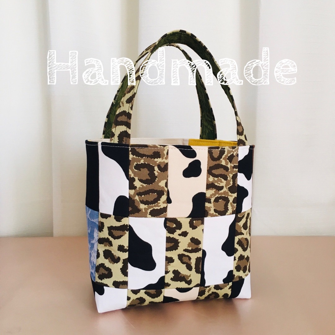 牛柄豹柄ハギレパッチワークトートバッグ 白 カーキ *ハンドメイドの通販 by Marie*ハンドメイドラクマ。
