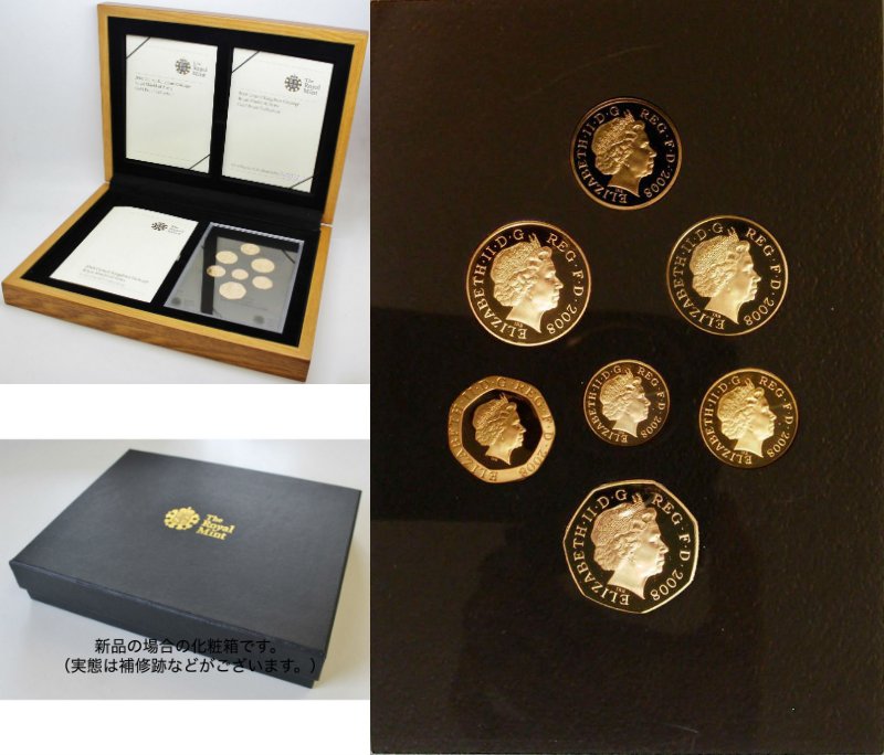 イギリス 硬貨デザイン一新 2008年 記念限定セット 全部で7点 全てゴールド 6点組み合わせてイギリス紋章 プルーフイギリス 王立造幣局発行発行証明書 木箱・化粧箱入り 化粧箱に補修跡ありエッジーコイン 世界のアンティークコイン。