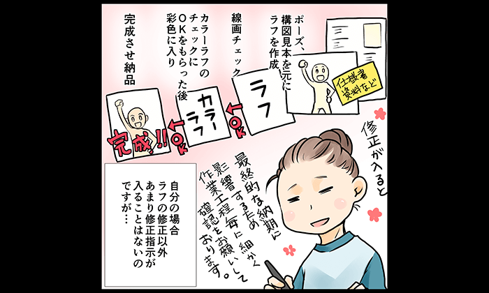 絵の仕事の流れ こまめに連絡取りつつ、ラフ提出→直し→本データばしでざ。