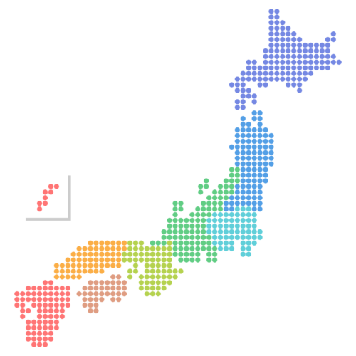 日本地図のドットイラスト画像<地方区分色分け> - 日本地図無料イラスト素材集。