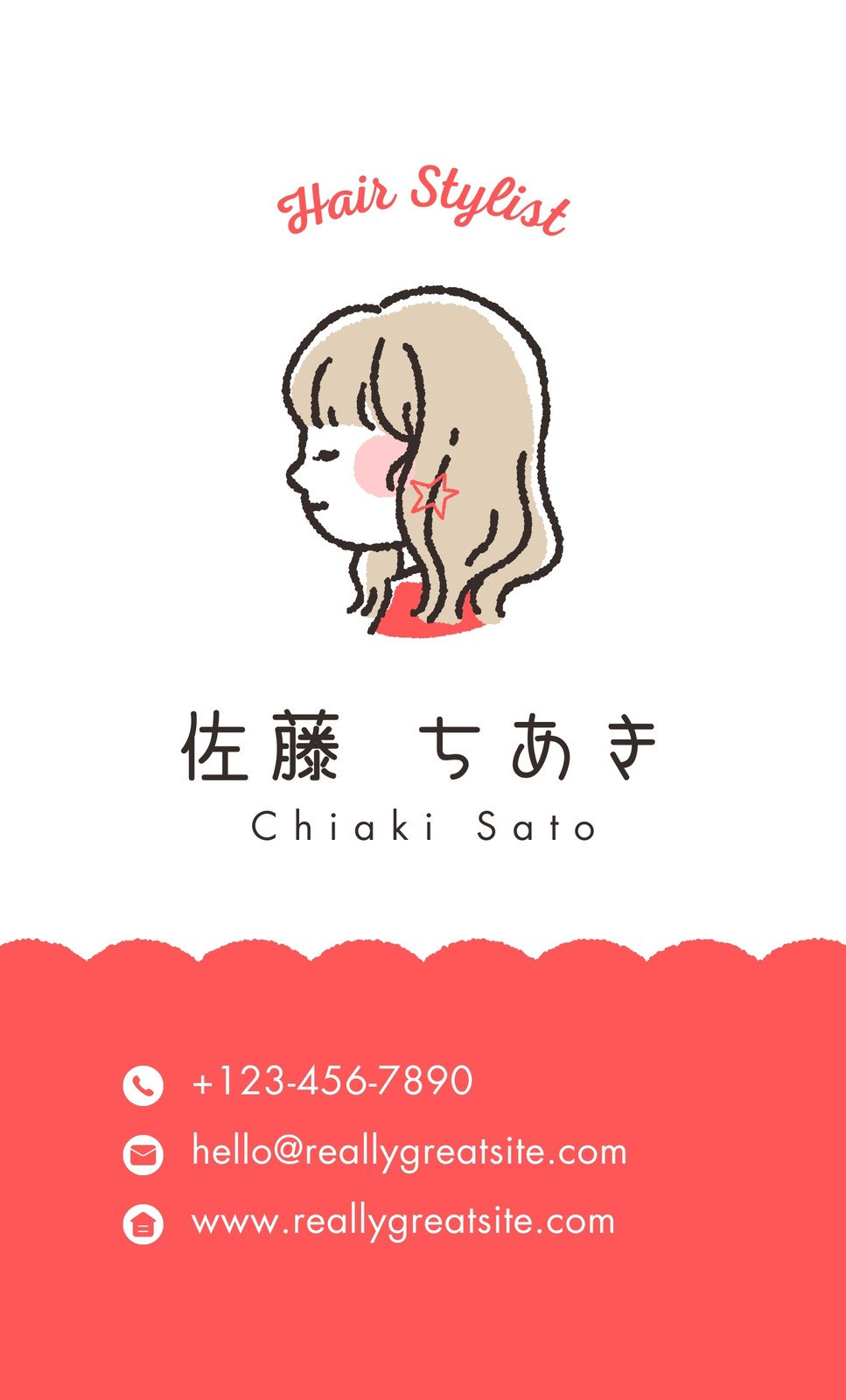 美容師名刺。可愛い女性ヘアドレッサーのイラスト。右手にはさみを持ちポーズ。かわいらしい。