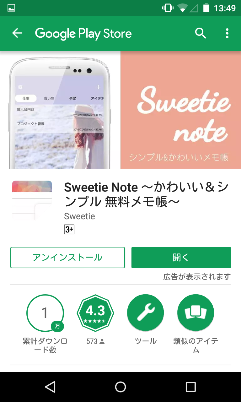 □Sweetie Note ~ 好みの写真に背景を入れ替えられるシンプルメモ帳 : Android☆SQUARE。