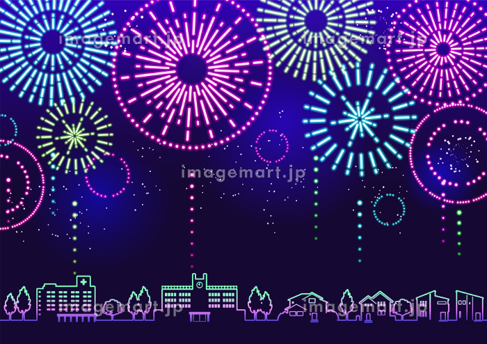 ネオンカラーに輝く花火が上がる街並みのイラスト200867809- イメージマート。