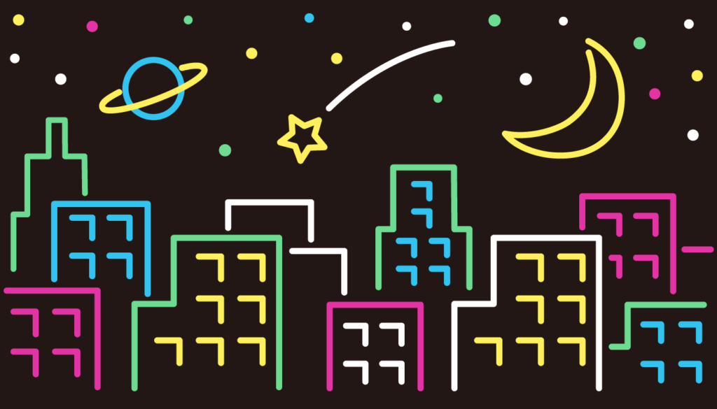 都会のビル群 ネオンサイン風の壁紙:イラスト無料。