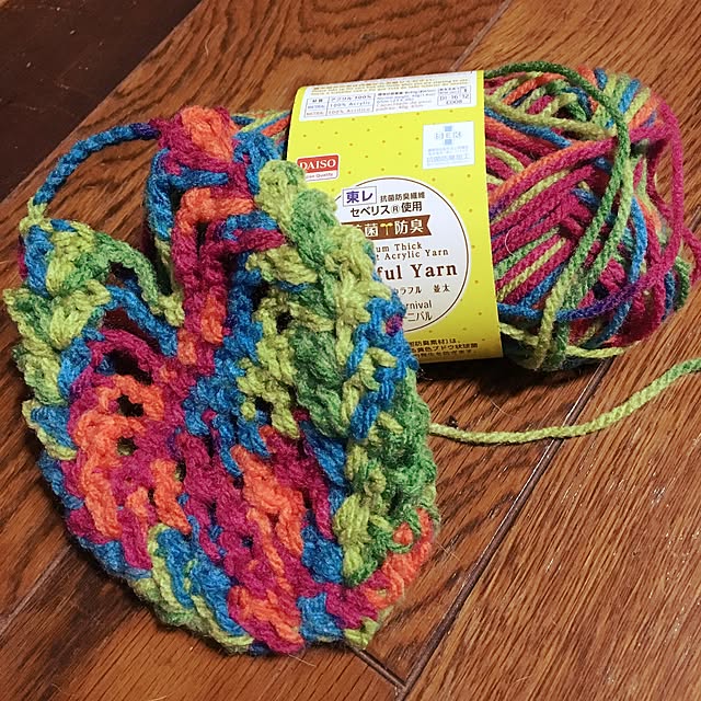 ダイソーのカラフルなアクリル毛糸で作るたまあみのアクリルたわし。